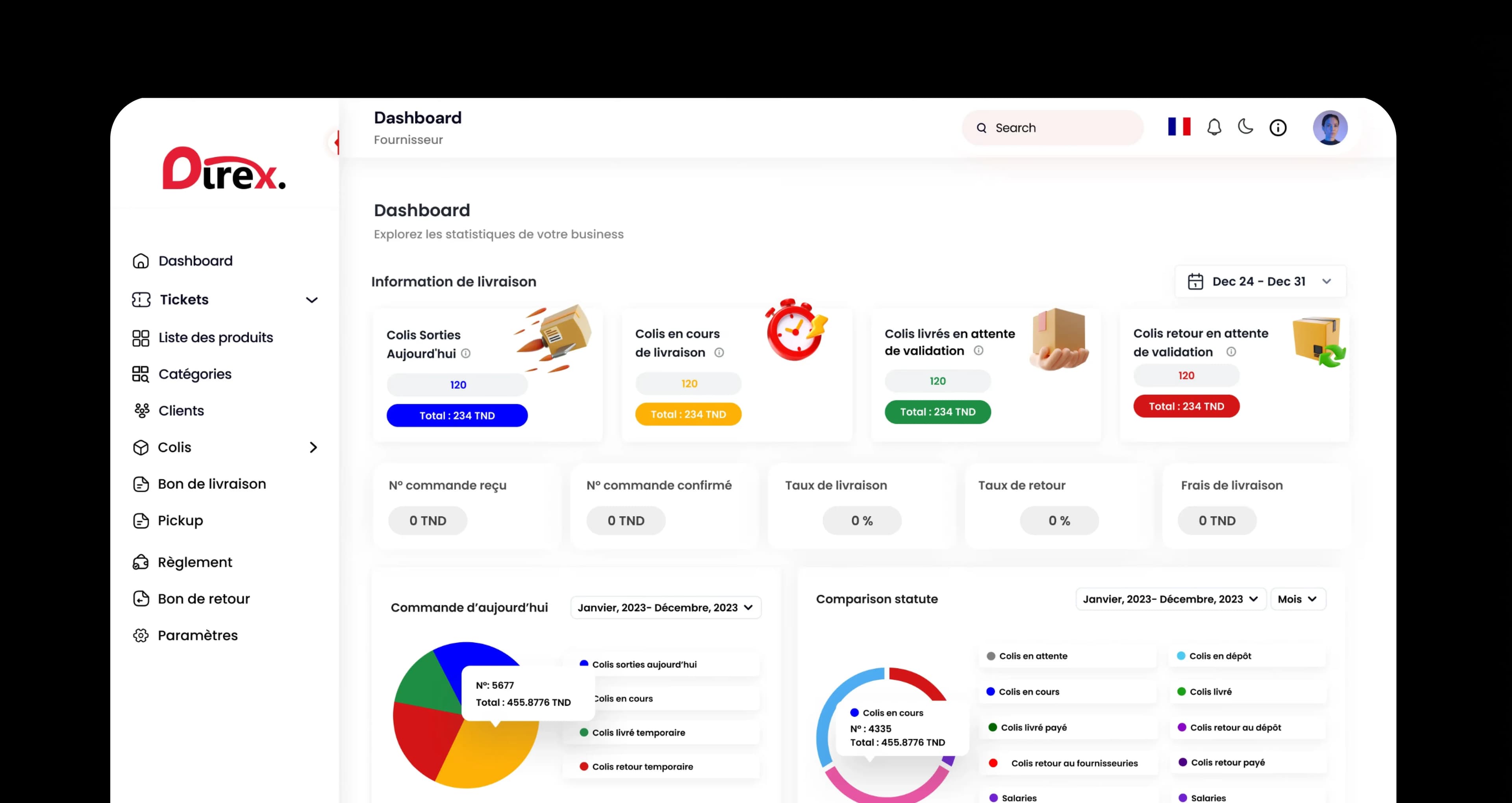 Suivez facilement les analyses des utilisateurs pour obtenir des informations importantes. Surveillez les performances de livraison, identifiez les tendances et prenez des décisions éclairées pour améliorer vos opérations.